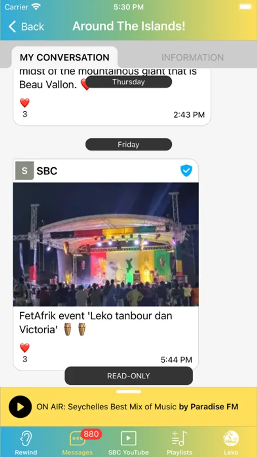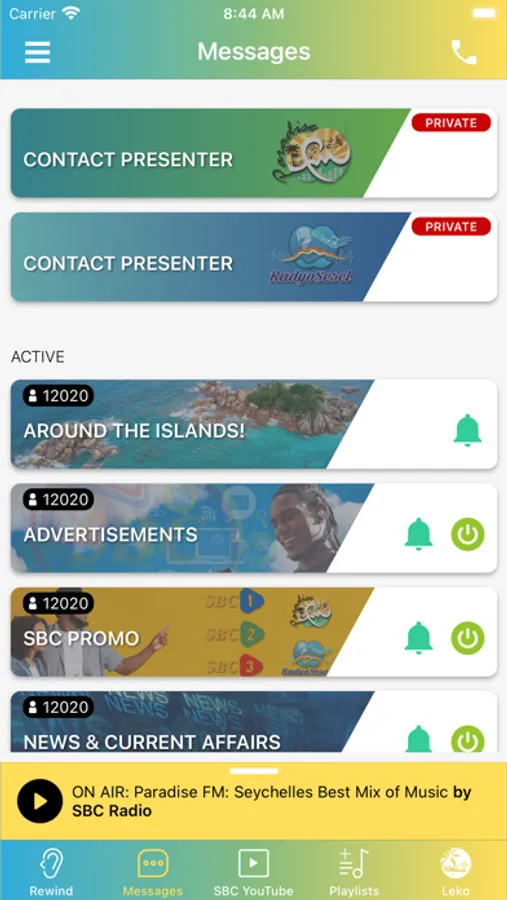 SBC Radio is the official application for Radyo Sesel and Paradise FM, operated by the Seychelles Broadcasting Corporation and offers a wide range of services and fun interactive features. SBC Radio provides access to the broadcaster’s Leko service which offers a perfect blend of archived programs, current programs, retro music, current music as well as traditional music.