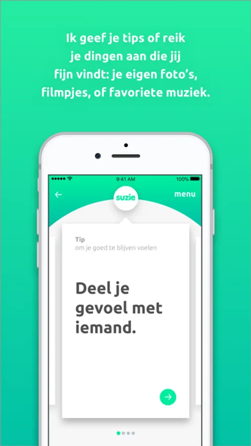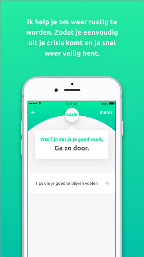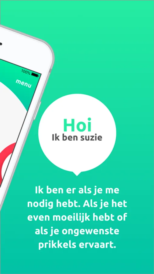 Verslavingszorg Noord Nederland behandelt mensen die kampen met verschillende soorten verslavingen in alle gradaties. Wat patiënten gemeen hebben is dat ze tussen de behandelingen door moeilijk prikkels kunnen weerstaan. Suzie is de app die hen hierbij helpt; Suzie kalmeert in in een spannende situatie, zodat de prikkel om te gebruiken minder wordt. Dankzij Suzie gaat de bui over.