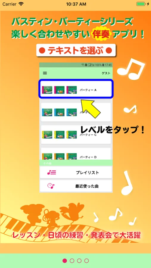 バスティン・パーティー教本に掲載されました曲の伴奏を再生するアプリです。また、教本には聴音の単元もあります。ページに合った聴音問題も例として入れてありますので、参考にしてください。