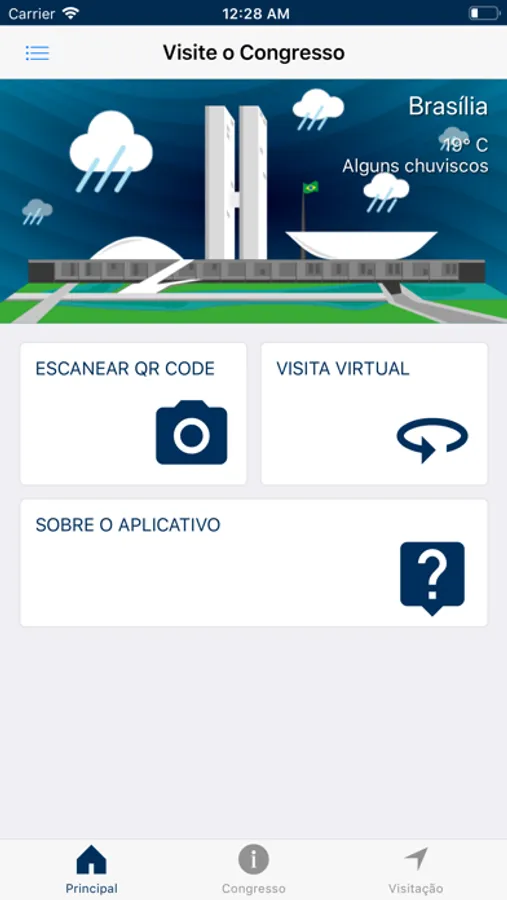 Reúne as principais ferramentas do aplicativo. Logo nesta tela é apresentado o tempo atual em Brasília, para ambientar o usuário com o tema de "visitação ao Congresso".