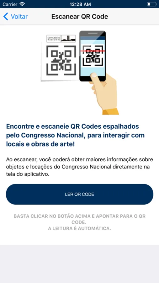 -- ESCANEAR QR CODE: ao abrir essa tela, o usuário poderá escanear QR Codes, para obter mais informações sobre obras de arte e locais do Congresso Nacional;