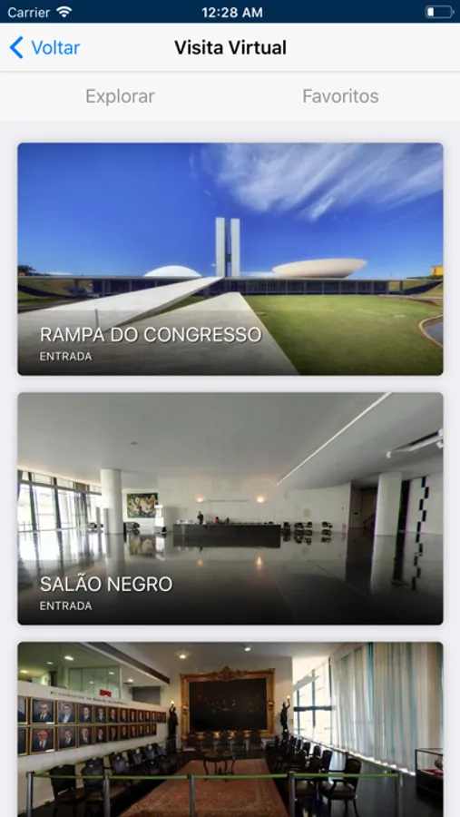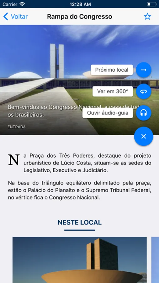 -- VISITA VIRTUAL: conheça cada lugar do Congresso Nacional. Veja imagens dos locais, mapas, arquitetura e obtenha mais informações sobre obras de arte e locações do palácio do Congresso Nacional. Você poderá ainda ouvir audioguias e visualizar algumas salas em 360 graus;