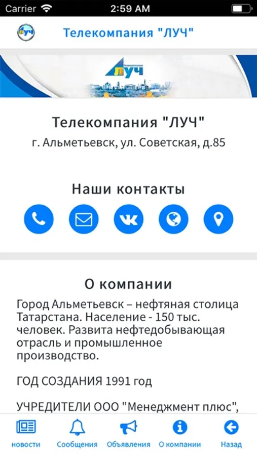 Телекомпания "Луч" - это ежедневная информационная программа «Новости», «Город: день за днем», «Поколение Татнефть», «Спорт-тайм», «Жомга», «Ислам нуры»,«Музыкальный сувенир», «Прогноз погоды», «Право на порядок»,«Лучшее из архива».