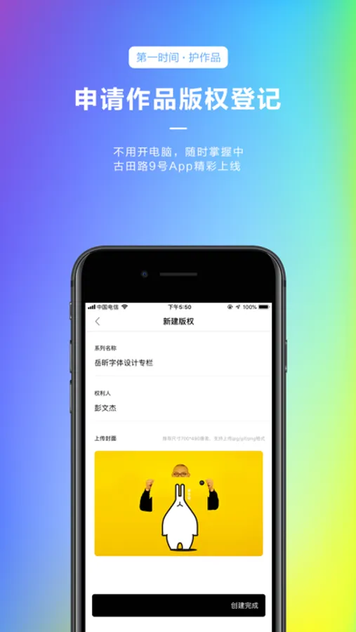 古田路9号APP现精彩上线,在原有PC端的基础功能上,为提升用户体验、着重优化以下四项:提供便捷安全的DCI数字版权登记功能,第一时间保护版权,申请DCI无需任何费用步骤简单;随手发现无限创意,手机即可一览海量精选作品;不再局限发布平台,随时随地都可发布优秀作品;加强社交互动功能,优化点评、点赞、分享等。