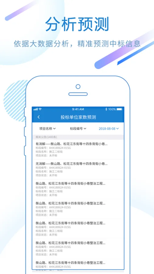 为施工企业提供投标数据支撑,协助施工企业提高投标的效率和命中率。可以查询开标数据和投标单位的历史下浮率,以及企业资质、业绩信息。通过大数据分析,展现方法和系数分布的概率,预测投标项目的单位家数、企业名单以及中标价区间,协助投标单位确定更加贴近中标的投标价格。