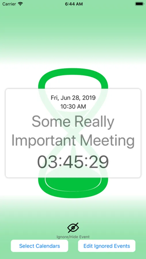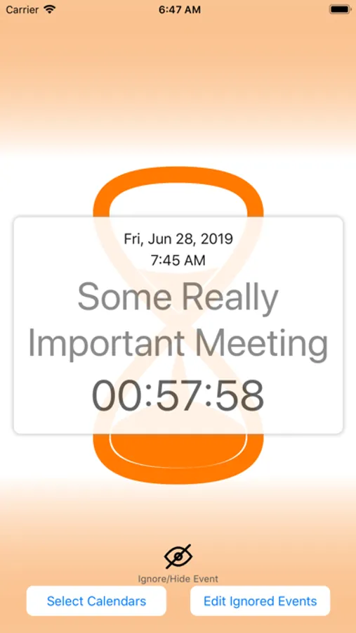 Cal Countdown also has the ability to ignore or skip certain events on your calendar. This feature is especially useful if you have shared calendars with your family, friends, or colleagues. We often have events on our calendars that we need to know about, but may not be attending ourselves. If you want Cal Countdown to ignore or skip these events and start counting down to the following event on your calendar, just tap the "Ignore" button, and Cal Countdown will immediately start a countdown to the following event.