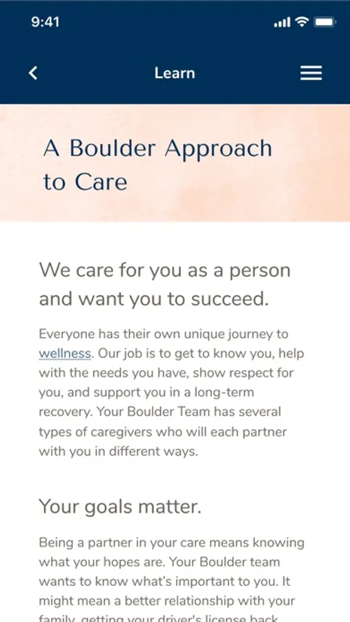 CUSTOMIZED TO YOU: At Boulder, patients and Care Teams make all the important decisions together. Recovery is different for each individual, so we tailor your care to you. Your goals are our goals — what matters to you, matters to us.
