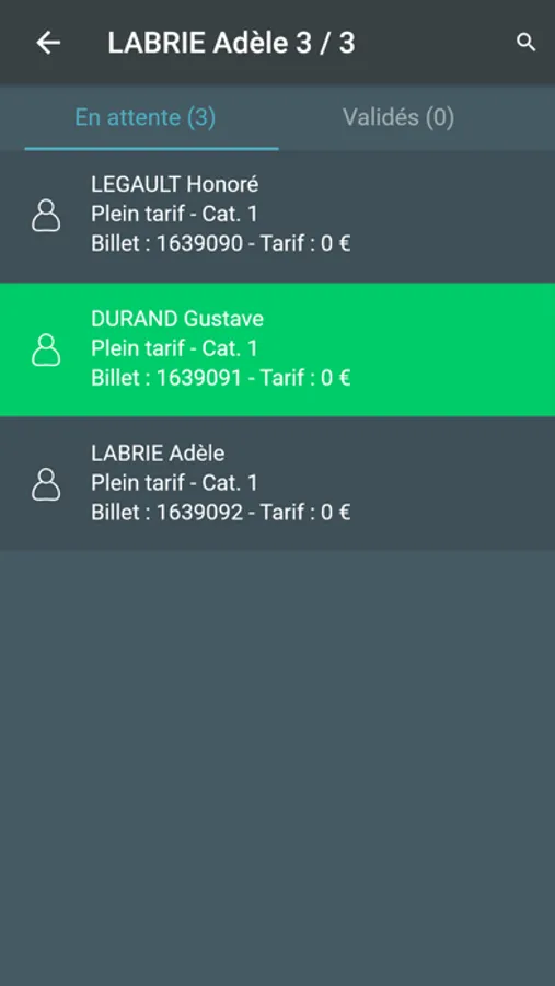 Pour résoudre rapidement ce type de problèmes, l’application prévoit également une fonction d’émargement, grâce à laquelle vous pouvez sélectionner à la main un billet dans la liste des participants. Un système de recherche par nom ou numéro de billet vous permettra de retrouver très rapidement votre billet.