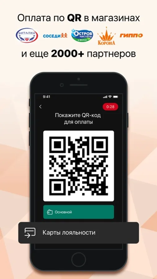 Оплачивайте покупки по QR-коду в магазинах Санта, Соседи, Корона, Остров чистоты и вкуса, Гиппо и еще у более 8000+ партнеров. Используйте виртуальные карты лояльности.