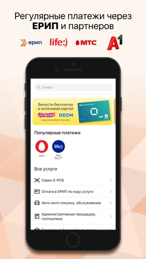 Используйте приложение для регулярных платежей через ЕРИП (мобильная связь, интернет, коммунальные услуги) и наших партнеров. Оплачивайте услуги по QR.
