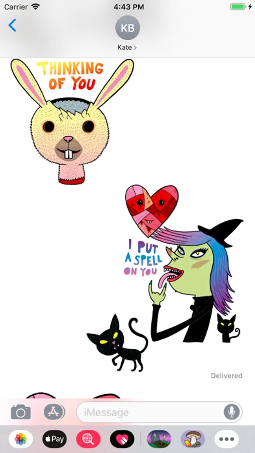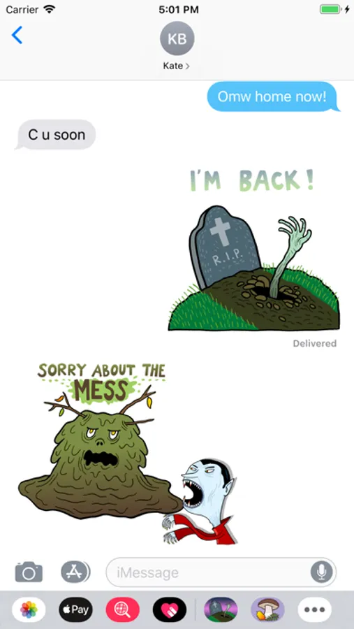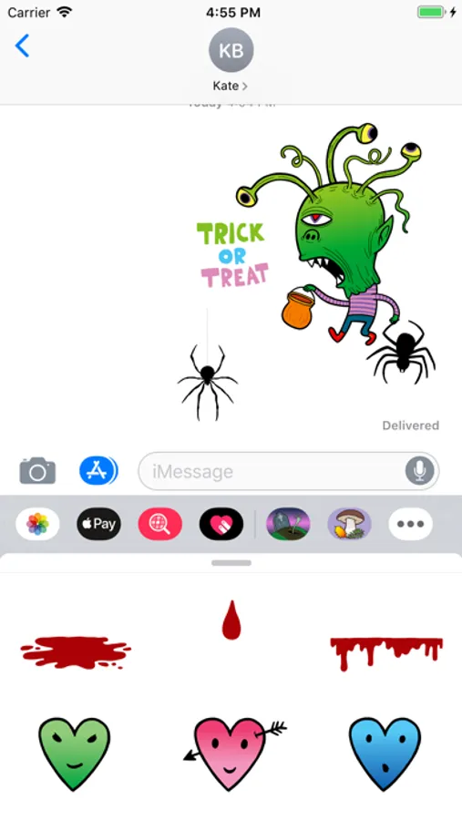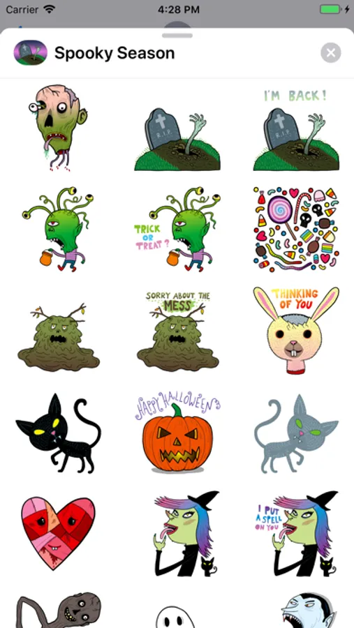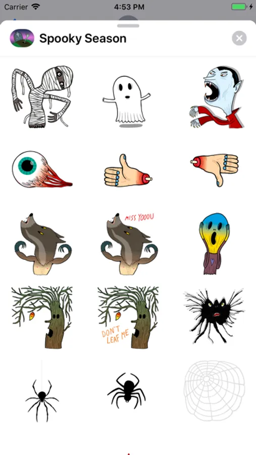 Show your Halloween spirit with these playfully spooky stickers! Use them as is or drag them onto your messages. Make your text bubbles stand out with dripping blood, dangling spiders, or whatever your ghoulish imagination can conjure.