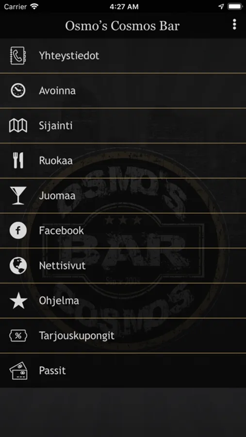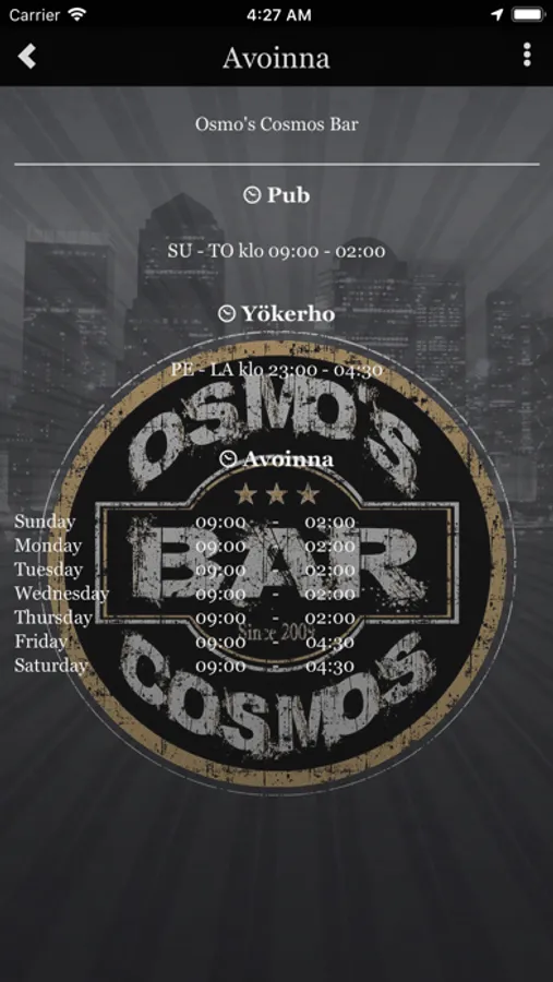 Osmo's Cosmos Bar. Ravintola Imatralla. ravintolassa yökerho, pub ja sporttibaari. Asiakaspaikkoja yhteensä yli 500. Yökerhossa esiintyjinä Suomen musiikkimaailman parhaimmisto. Sporttibaarissa näkyy kaikki urheilun maksukanavat. Drink, food and Rock and Roll.