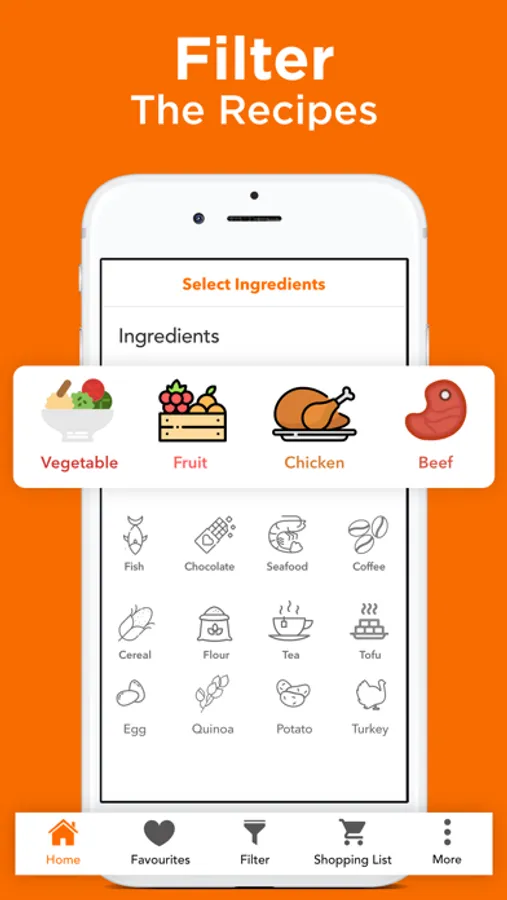 - Select your preferred ingredients to filter the recipes. “Filter” tool will allow you to search recipes.