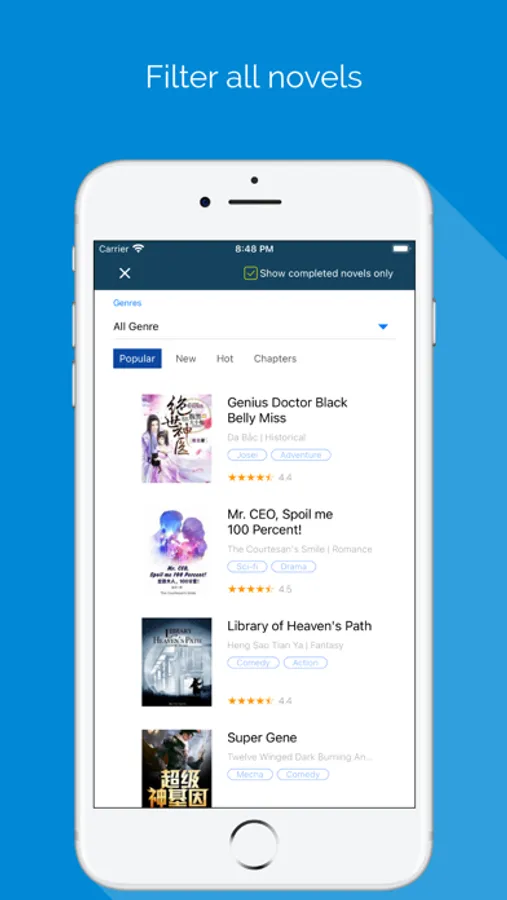 ● Select ANY GENRE you like: light novels, books with animation adaptations, stories with reborn heroes, magical realism, eastern fantasy, world of wuxia, horror stories, romantic love novels, fanfiction, sci-fi, books on video games, harem, adventure, xuanhuan, xianxia, martial arts and excellent original stories⋯ Download the app to find more!