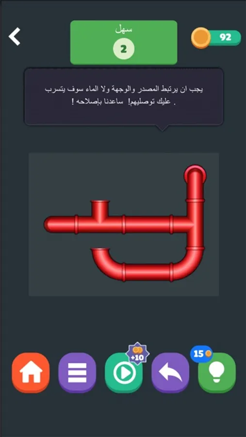 لعبة لغز الأنابيب تقوم بدور السباك الذي عليه ان يوصل شبكة من الأنابيب لنقل الماء من مكان الى اخر و لكن المشكلة ان شبكة النقل معقدة و تحتاج الى سباك ماهر فادر على التركيز و الأبداع لحل هذا اللغز، فالوصلات و الأنابيب كثيرة و لا تصلح كلها لنقل الماء و عليك ان تختار بدقة الأنابيب و الوصلة.