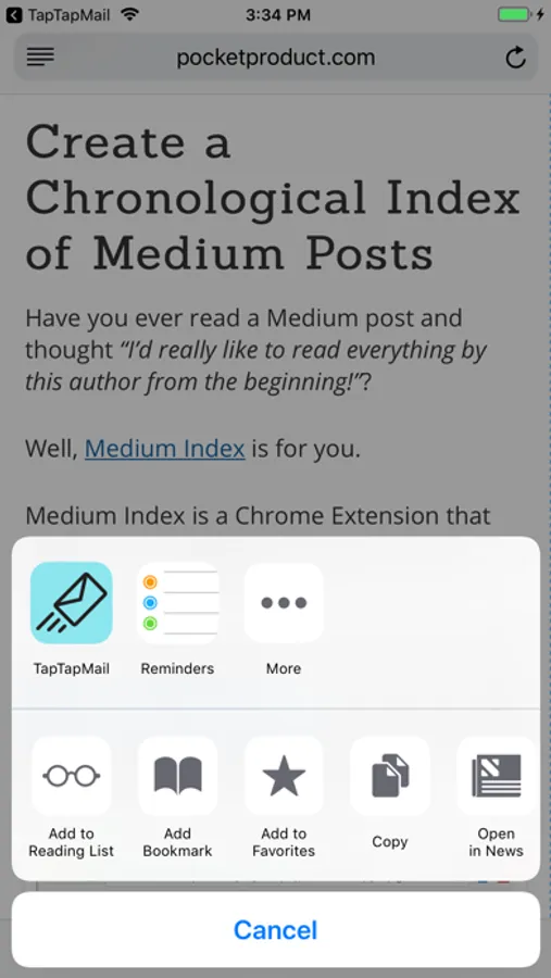 From inside other apps, like Safari, Twitter, and Medium, you can tap the Share icon and then tap TapTapMail, and the link will be emailed to you. That's 2 taps! No tapping all over the place to address an email.