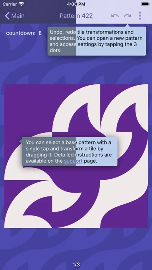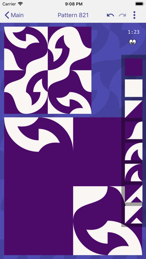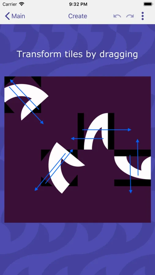 The boards on the game screens contain tiles (at the start the tiles display empty/solid squares). By tapping a tile, you can choose from eight basic patterns. By dragging a tile, you can flip or rotate the basic pattern on it. You can compose complex patterns from these tiles.