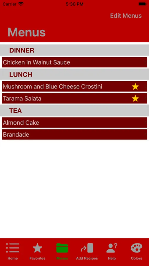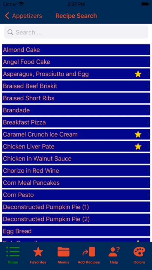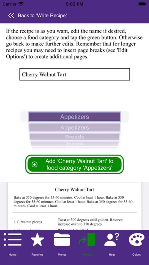 This app is designed for display of user-provided recipes for use in the kitchen, and may be thought of as as a sophisticated electronic set of file cards. In addition to displaying recipes it allows for constructing menus and a favorites list, defining food categories, renaming and recategorizing recipes, and sharing recipes on email, text, social media, etc.