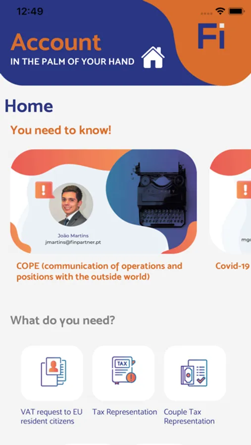 With the new Finpartner's app, you can now obtain accounting and financial services wherever you are, in seconds. Getting services like VAT request to EU resident citizens, or Tax Representation has never been so easy.