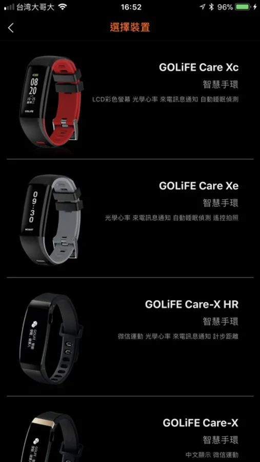 - 藍牙智慧手環 : Care Xe、Care Xc、Care X HR 心率血氧手環、Care X (含悠遊卡錶帶款)、GOLiFE Care、Care One