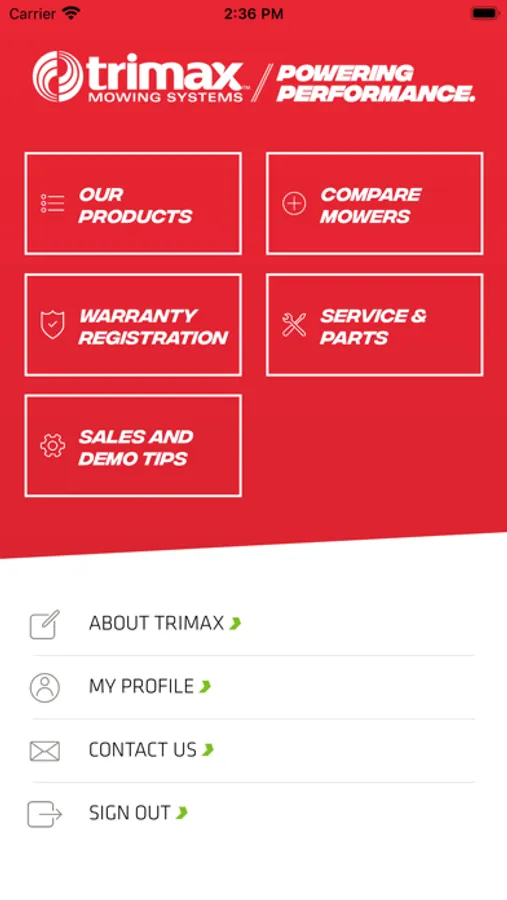 The Trimax Dealer App is a sales tool developed specifically for the Trimax Elite Dealer network. The app contains product info, pricing, sales and demo tips, and parts and service information. The library of information stored within the app is downloaded to your phone for quick and easy access even while offline.