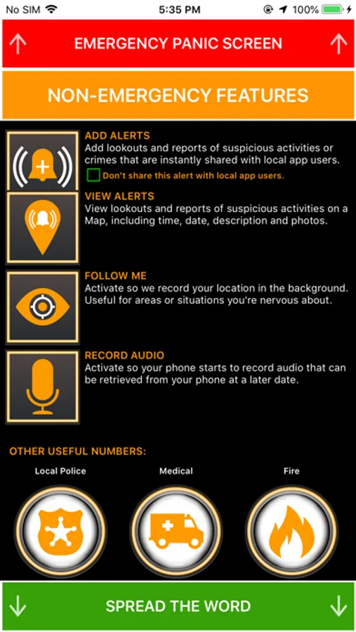 Sends your emergency contacts your location by SMS and, they can see your exact location in real-time. You can also add and receive local crime and suspicious activity reports. This app only uses GPS and data when it is open and being used.