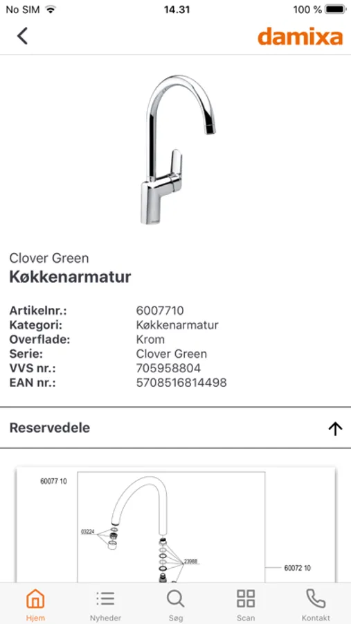 Søgeresultatet illustrerer både armaturenes reservedele og installationsdokumenter, for at installatøren kan danne sig et godt overblik over armaturet og se hvilke reservedele, der enten skal skiftes eller bruges, for at reparere armaturet.