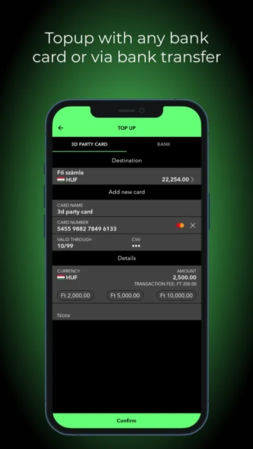 • topup your account with bank transfers to your dedicated bank account number or via a card issued by another bank,