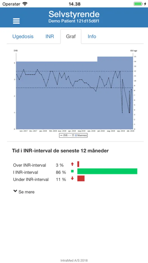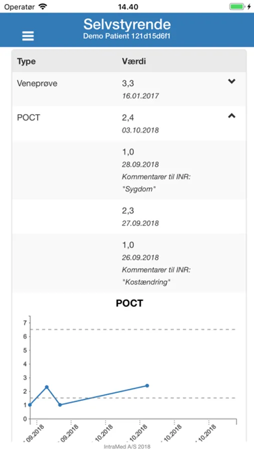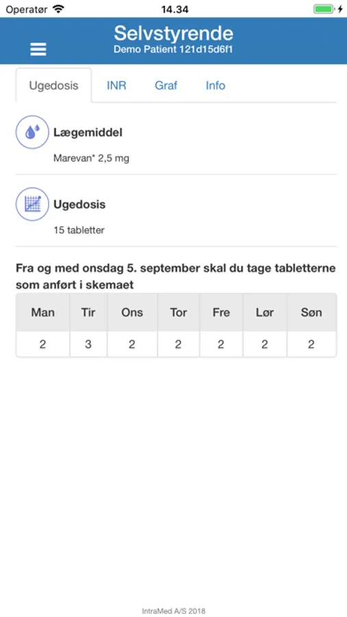 Der overføres kun data mellem din behandler og dig. Data sendes aldrig til IntraMed A/S. Du kan læse mere om hvilke data der overføres og gemmes ved at klikke på IntraMed A/S nederst i skærmbillederne i app'en, eller på vores hjemmeside.
