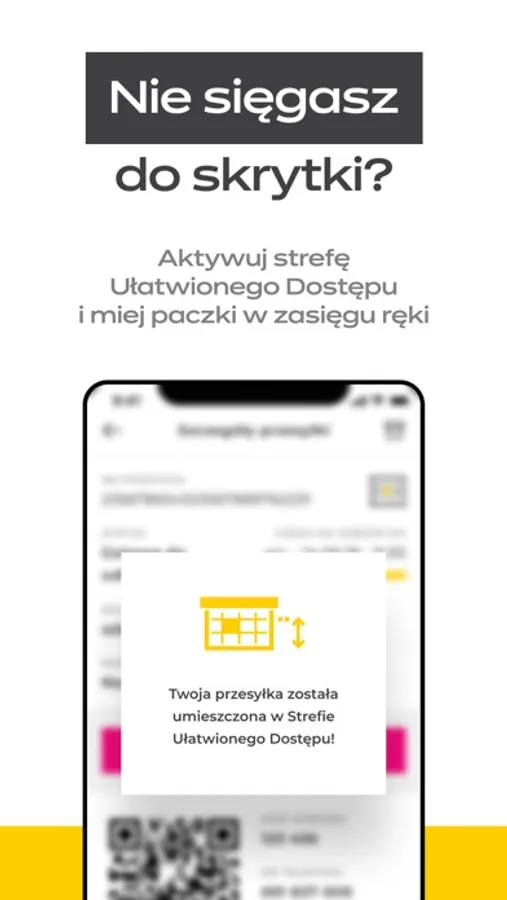 Strefa Ułatwionego Dostępu to rozwiązanie, które umożliwia dostawę paczek do niżej położonych skrytek w urządzeniu Paczkomat. Funkcjonalność jest skierowana do osób niewysokich oraz osób z niepełnosprawnościami. Jeśli chcesz, aby paczka została umieszczona w Strefie, w szczegółach przesyłki przy pytaniu „Czy umieścić przesyłkę w Strefie Ułatwionego Dostępu?” wybierz przycisk „Aktywuj”.