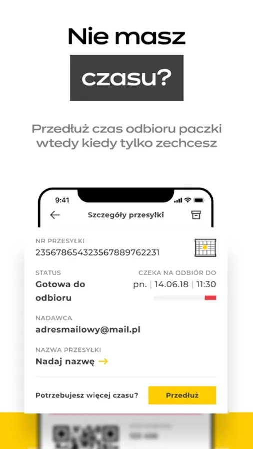 Każdy użytkownik aplikacji może wygodnie przedłużyć czas odbioru przesyłki przez Paczkomat o 24 h. Usługa przedłużenia czasu odbioru jest bardzo intuicyjna – na 12 godzin przed upłynięciem terminu odbioru paczki w apce pojawi się przycisk „Przedłuż”. Należy w niego kliknąć, zapłacić i… gotowe!