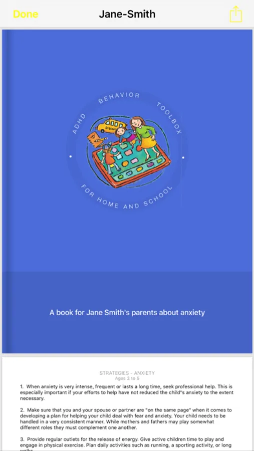 The parent or school can get a set of strategies based on the age of the child and where the strategies are needed. They can view the strategies instantly on their device, print them, save them in PDF format, send them to Apple Books, as well as emailing or texting them with an attached note with their own specific instructions or comments. It can be used as a communication device between home and school in terms of sharing effective behavioral and teaching strategies.