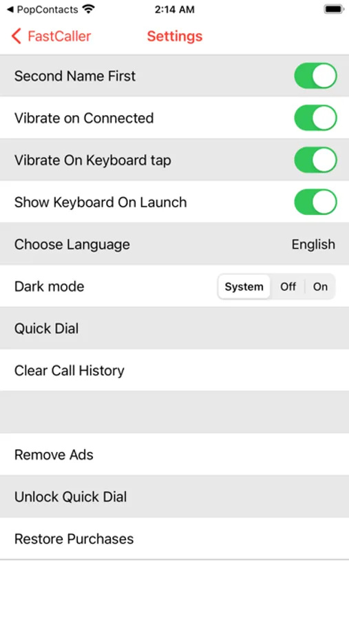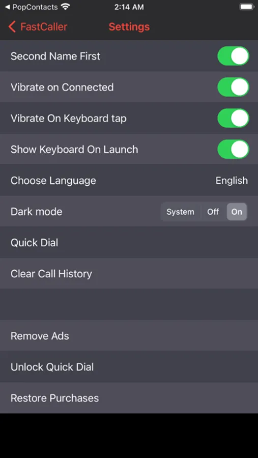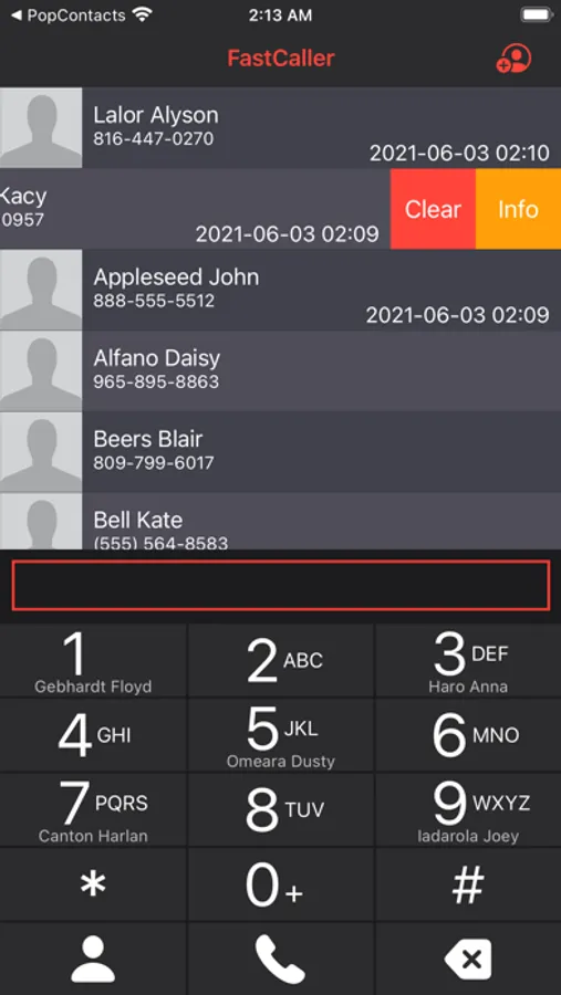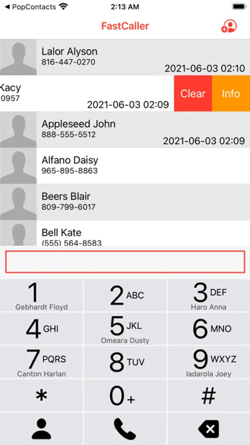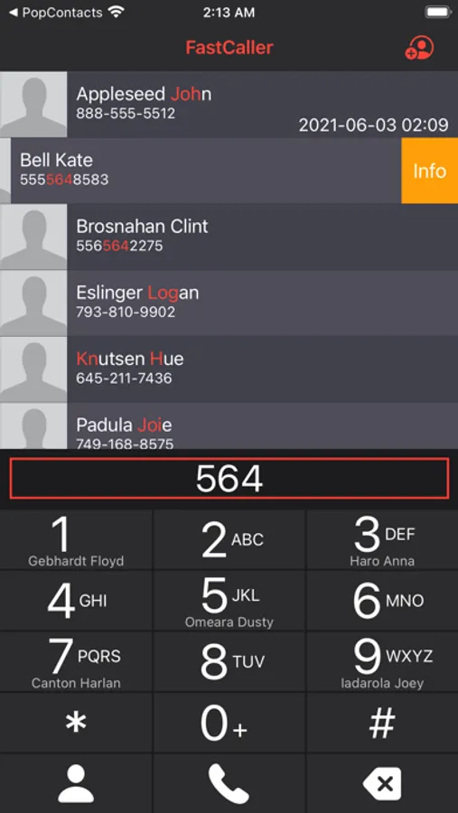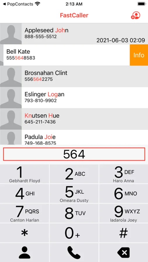 It looks through all the names and numbers, so you will quickly find the required contact even if you know only a few digits of the phone number or only part of the name. Just start typing on the keyboard and an intelligent search will help you! Depending on the language you have selected it will show characters for English and your selected language and will search both.