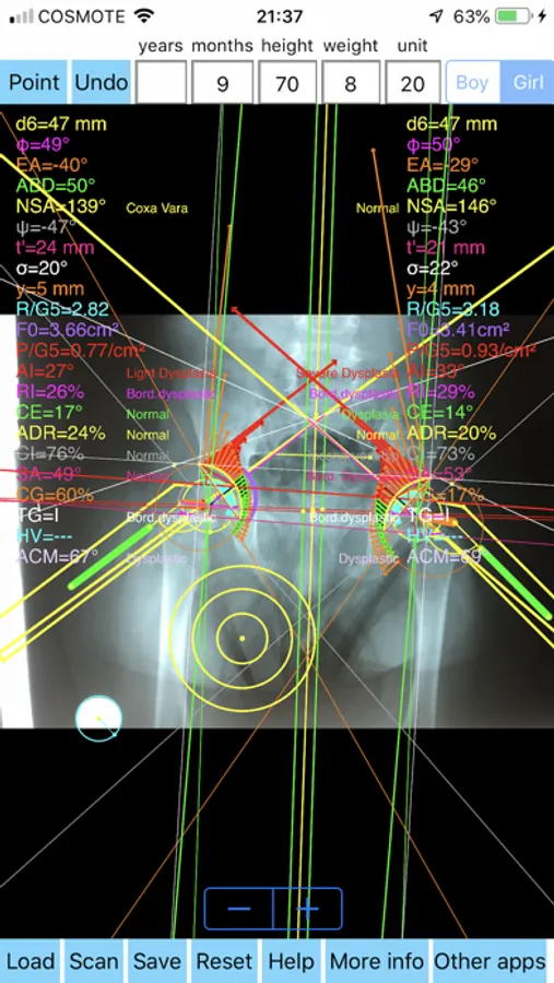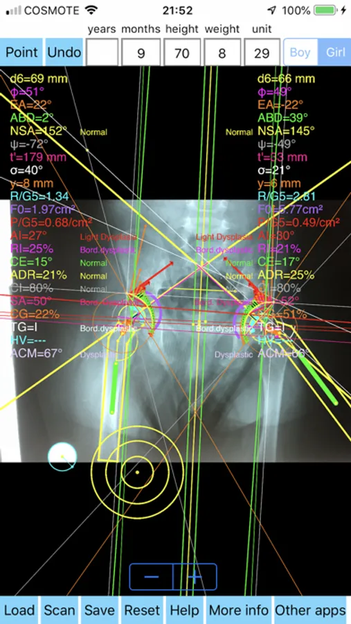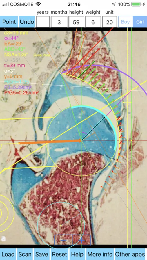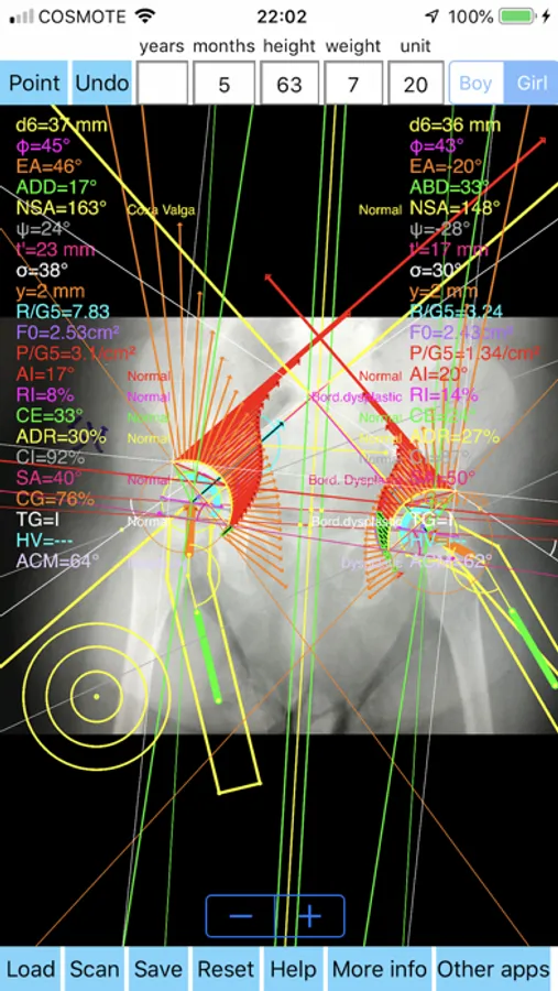 How it works? By choosing a few anatomical landmarks of measurement on X-rays captured in the screen the Papadimitriou Abduction splint Application calculates the whole range of measurements in seconds offering great aid to the surgeon. Sixteen radiographic indexes like Hip Value (HV), Acetabular Center Margin angle (ACM), Acetabular Index (AI), the Center-Edge (CE), the Acetabular Depth-Width Ratio (ADR), the femoral head extrusion index or Reimer Index (RI), the Congruity Index (CI), the Sharp’s angle (SA), Tonnis grade of dislocation (TG), the Acetabular Index of the Weight-Bearing Zone (AIW), Congruence Index (CG), the degree of abduction of each femur (ABD), the entry angle (EA), the Neck-shaft angle (NSA), load (R) pressure (P), Surface Weight-Bearing Zone (F0) are measured. The current abduction or adduction of the hip is measured and by scrolling a button you can virtual change the position of the legs. By placing more or less Abduction, the app concurrently calculates load, pressure and its distribution in the new position, which is printed in real time over the X-ray. Each time you change the degree in real time the distribution of pressure is printed for the corresponding degree of abduction. Within this procedure all data are recalculated live in front of your screen, thus allowing to find easily the biomechanically sound position (concentric distribution of pressure inside the acetabulum). This procedure helps decide in an instant the optimal position of abduction of the extremity by changing the abduction of the brace to the suggested advantageous degree of abduction, without repeating X-rays. This will promote uniformly remodelling of the dysplastic acetabulum towards normal, saving time for successful outcome. In addition the colour of the pressure vectors adds very important informations about the exerted pressure in the acetabulum - red means not favourable pressure -green means favourable pressure thus stimulating the growth -green with black colour inside means very potent stimulus to growth.The changing colours of depicted pressure vectors and the changing magnitude of pressure vectors which are depicted respectively by the changing length of vectors - arranged over the acetabulum- helps and informs the surgeon both qualitative and quantitative in an instant, if the distributed forces are promoting the growth of acetabulum (green vectors) and helps decide the optimal position of the leg in abduction by the splint .