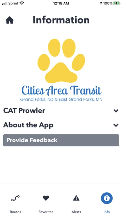 The CAT Prowler app provides real-time bus arrival information for Cities Area Transit, serving Grand Forks, ND, East Grand Forks, MN, and the University of North Dakota.
