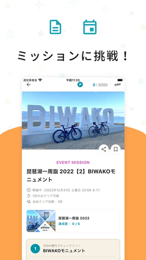 マップの現在地から周辺にあるミッションを探してみよう。お腹がすいたらグルメミッション、週末に家族でできるチャレンジミッション、サイクリングで運動しながらできるミッションや街歩きを楽しむクイズミッションなど今の気分に合うミッションに挑戦!クリアするとポイントがもらえるよ。