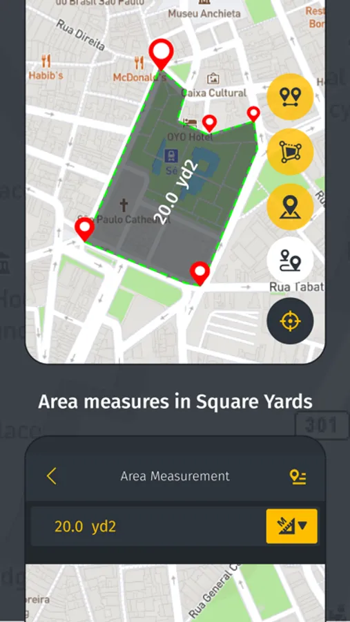 Fields area Measure is a smart tool for measuring areas on the map. Once you place your points on the map and then calculate area between all point. you can also calculate total Area of ant Route.