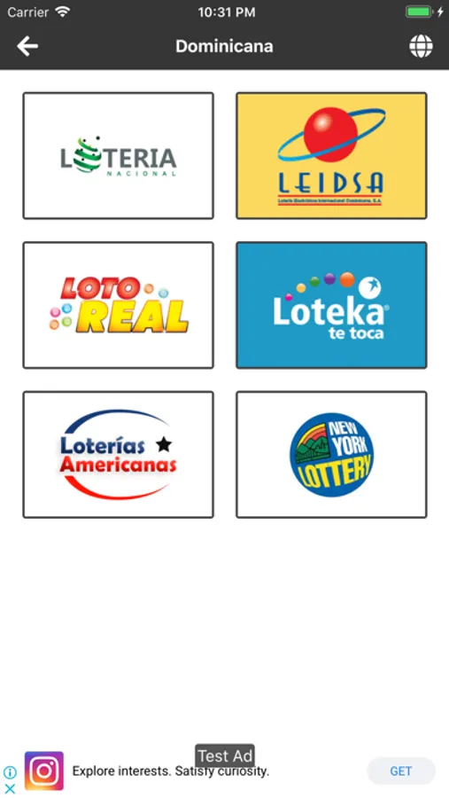 Cuando abres la aplicación Loto Mundo por primera vez debes seleccionar tu país de interés, esta selección se guardará y automáticamente que abras el Loto Mundo App en el futuro te van a salir las loterías de este país. Si quieres cambiar la selección del país, simplemente presiona el globo en la parte superior del lado derecho y haz nuevamente tu selección.