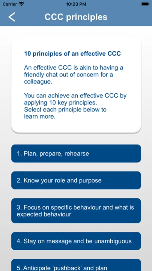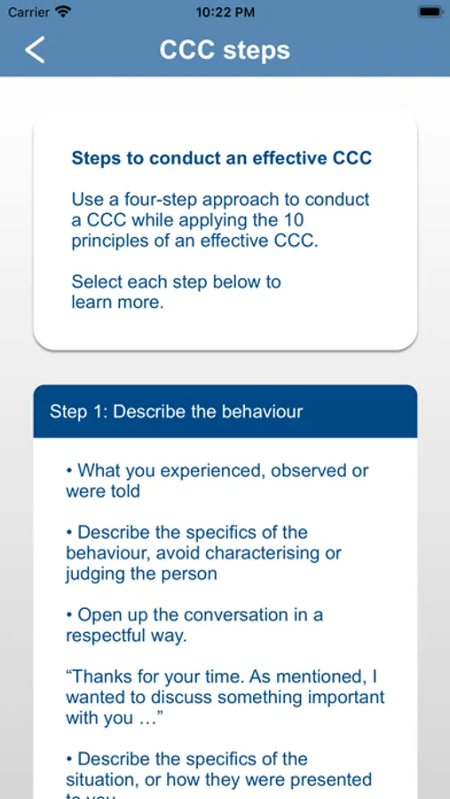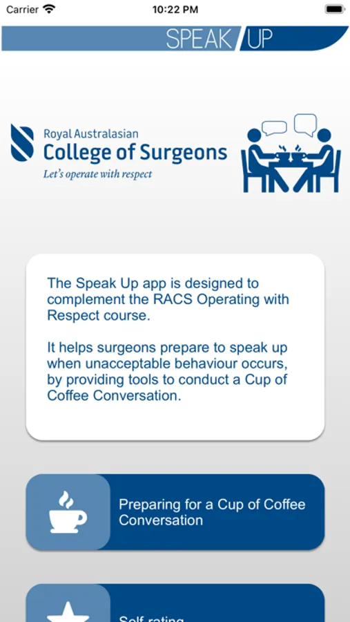 Where unacceptable behaviour occurs, it is important to speak up. The tools in this app will help you to prepare for a Cup of Coffee Conversation (CCC).