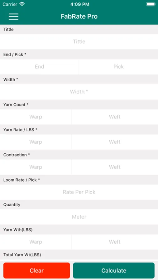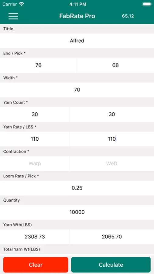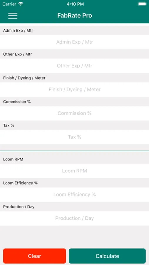 You just after entering required information Click on the Calculate button and the Fabric rate calculated automatically is shown in the Top Bar of App and Warp Weight and Weft weight is calculated in the specified fields you see.