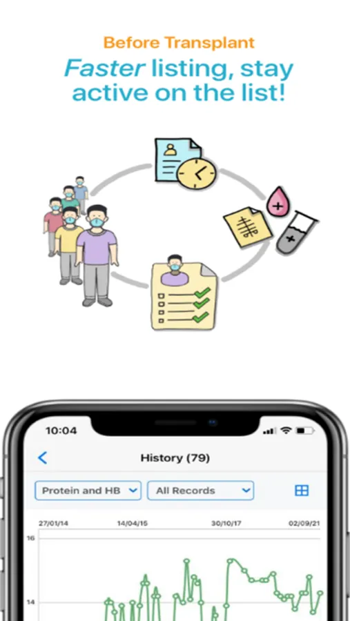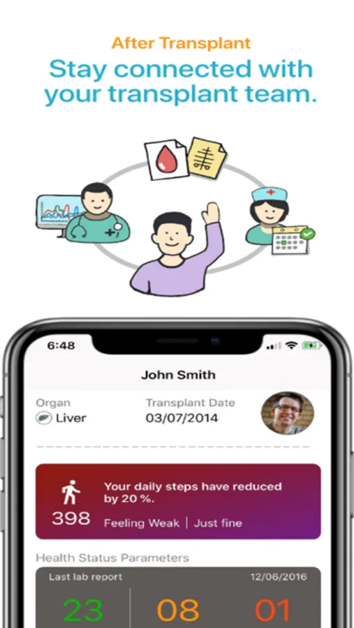 The Transplant Care app is a comprehensive, secure and intelligent app for organ transplant patients. It supports care protocols for the complete care life cycle before and after a transplant. It offers comprehensive coverage of the pre-transplant workup that patients are required to go through. It allows patients to keep track of all their medical data and care over a long span of time. Optionally patients can stay in direct contact with their attending doctors and receive care plans directly in the app. The app supports patients with education, engagement and empowerment to reduce the disease complications and improve long term post-transplant outcomes.