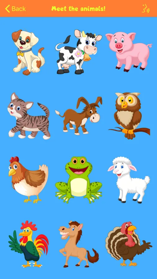 • dog, cat, hen, rooster, cow, donkey, frog, horse, pig, owl, sheep, turkey