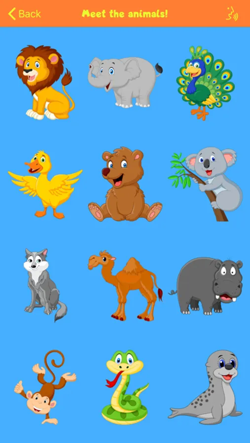 • lion, duck, wolf, monkey, elephant, bear, camel, snake, peacock, koala, hippo, seal