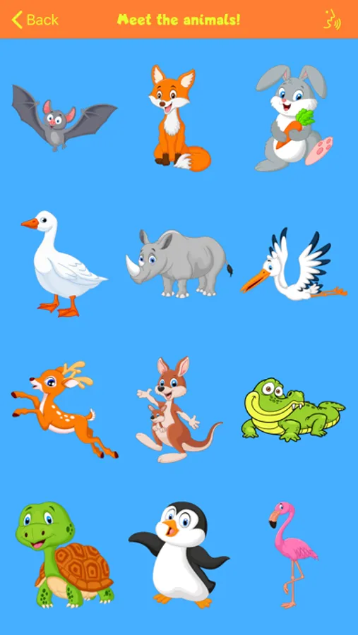 • bat, goose, deer, turtle, fox, rhino, kangaroo, penguin, rabbit, stork, crocodile, flamingo