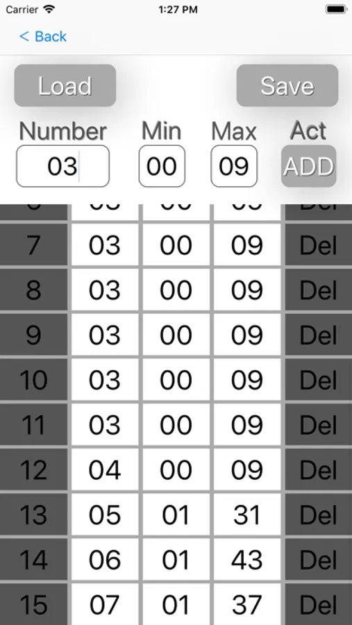一覧の「Del」以外をタップすると、その行の内容が個数(Number)、最小値(Min)、最大値(Max)に設定されます。