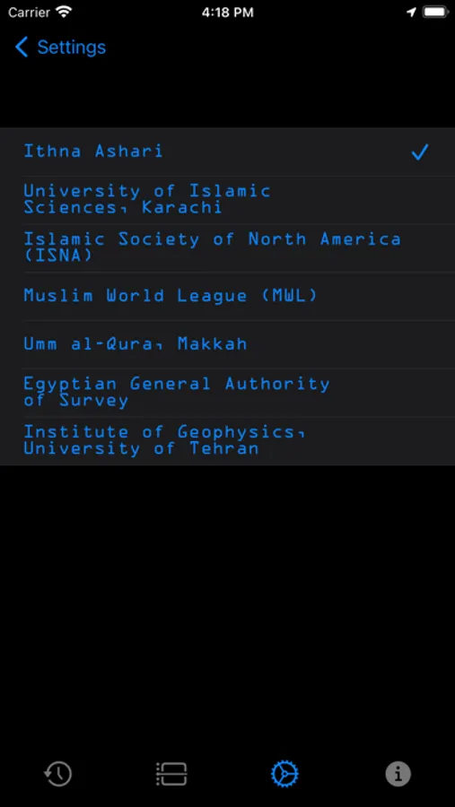 * Prayer Timings are being computed in multiple calculation methods (Ithna Ashari, University of Islamic Sciences, Karachi, Islamic Society of North America (ISNA), Muslim World League (MWL), Umm al-Qura, Makkah, Egyptian General Authority of Survey, Institute of Geophysics, University of Tehran).