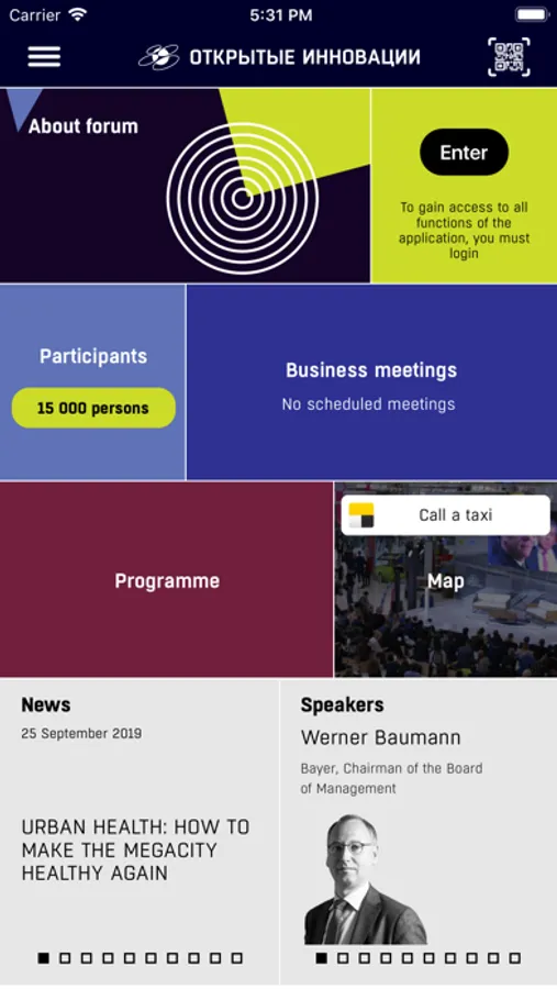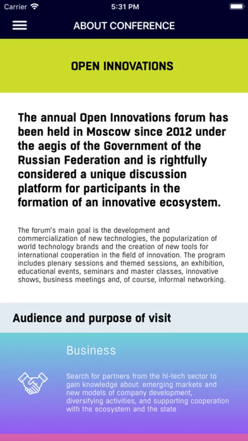 The official mobile application of the Moscow International Forum of Innovative Development "Open Innovations" — the annual forum devoted to new technologies and prospects of international cooperation in the field of innovations. The Open Innovations forum is held in Moscow since 2012 under the auspices of the Russian Government.