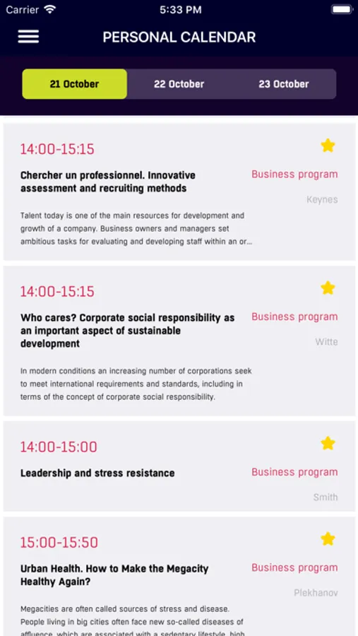 The application allows the registered participants easily look through the forum's program and vote for favorite sessions. It also gives a possibility to form your personal schedule by choosing sessions. Participants plan meetings with other participants within the forum using Business Contacts Exchange service, and also receive answers to the most frequent questions.