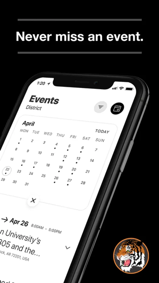 The event section shows a list of events throughout the district. Users can add an event to your calendar to share the event with friends and family with one tap.