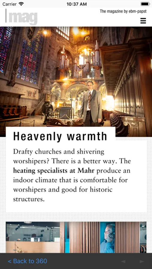 Get an overview and stay informed – with the 360° app from ebm-papst. The first version provides you with easy access to operating instructions and “mag”, the customer magazine. In the future, you will receive updates with additional practical functions for fan management, planning visits to trade shows and events, and even more news about the world of ebm-papst.